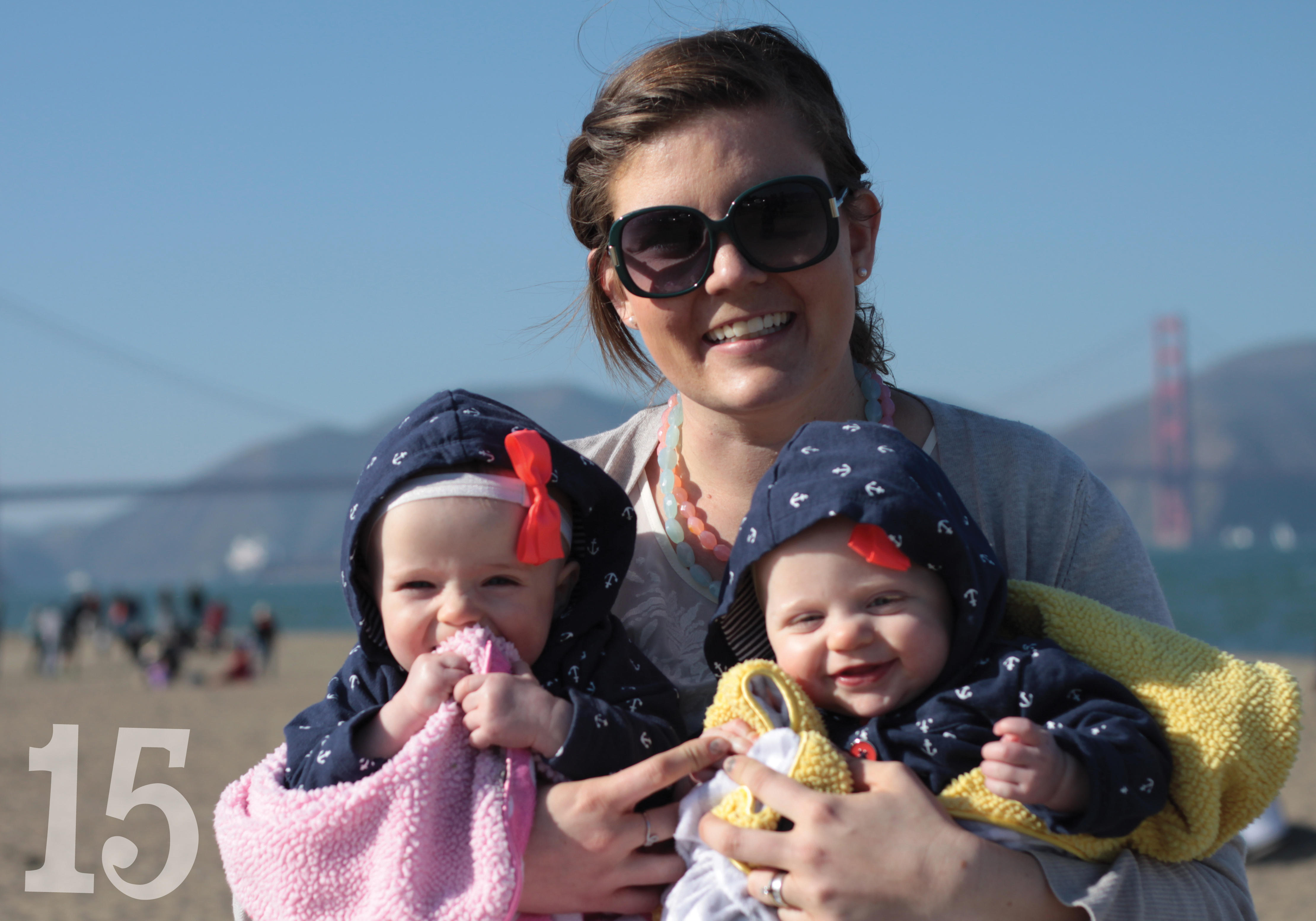 THIRTEEN – FIFTEEN: We took the longest walk of our lives! We started at the Fisherman’s Wharf, went to Chipotle, and then made the trek towards the Golden State Bridge. It was miles, but so much fun. We saw cool people, got beeped at by bike riders, and fed you two in some windy conditions. Hint, if you two ever have kids, never feed in windy conditions. Oh yea! On another feeding, near the wharf, we fed you two on a park bench, and these three elderly Russian ladies oogled and awed over you two. We didn’t really understand them, but just nodded our heads at whatever it was. It was a hoot. If you ever go to Russia, let daddy know, I’m pretty sure we were offered a villa there somewhere.