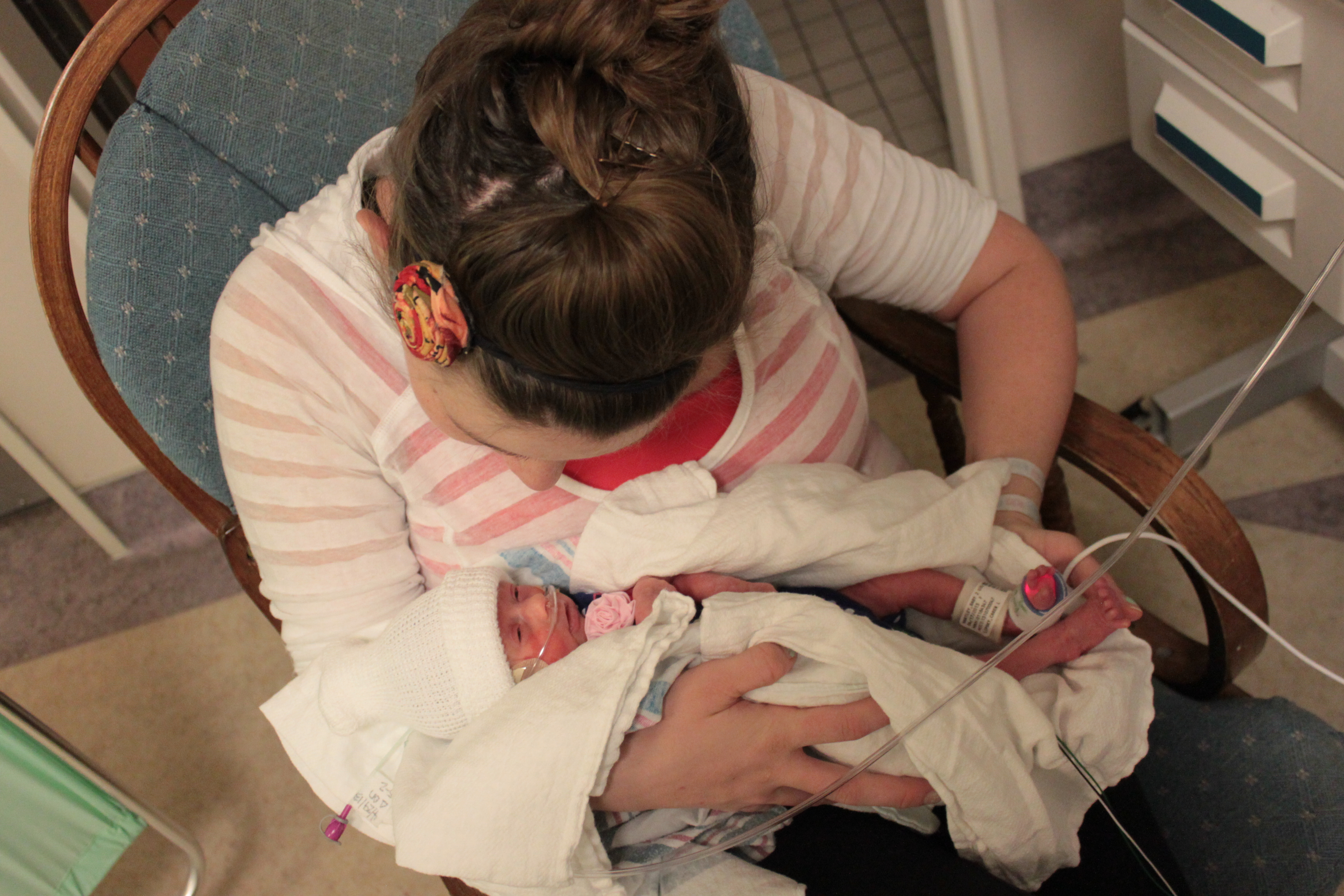 March 23 turned out not to be a normal day at the doctor’s office, because when Dr. Boles checked out Mom, we heard “you’re dilated and I’m admitting you to the hospital right now”. Yea, you don’t want to hear those words either. Mom was 27 weeks, and you two we barely pushing two pounds. 10 minutes later, Mom was laying down in Room 108. For 30 days, Room 108 was home. Daddy dropped school. He took a week off of work, and we prayed. We prayed all the time. It was one of those weird times of “we really want to meet you, but we really want you to stay in mom’s tummy”. To pass the time, Dad brought the big screen TV from home so that mommy could read the little letters on Wheel of Fortune. Another huge part of “Room 108 World” was the overwhelming response from Mommy and Daddy’s friends. Mom never had to eat a hospital meal, because Hallie, Cari, your great-grandparents, your Aunt Kirsten, your nana and papa, and many others provided meals for us. Your nana would come and stay with Mom when Dad returned to work. She’s such a huge blessing! She was always ready to step in and help. She kept the nurses on their toes, and even helped mommy with baths and stuff. We also had amazing nurses help mommy out. Nurses like Veronica, Nora, and Kim were especially helpful because they put mommy and daddy’s mind at ease when a monitor would beep or if she was having contractions. Oh, and mommy got pneumonia while in Room 108. We’re so glad Room 108 is behind us now!
